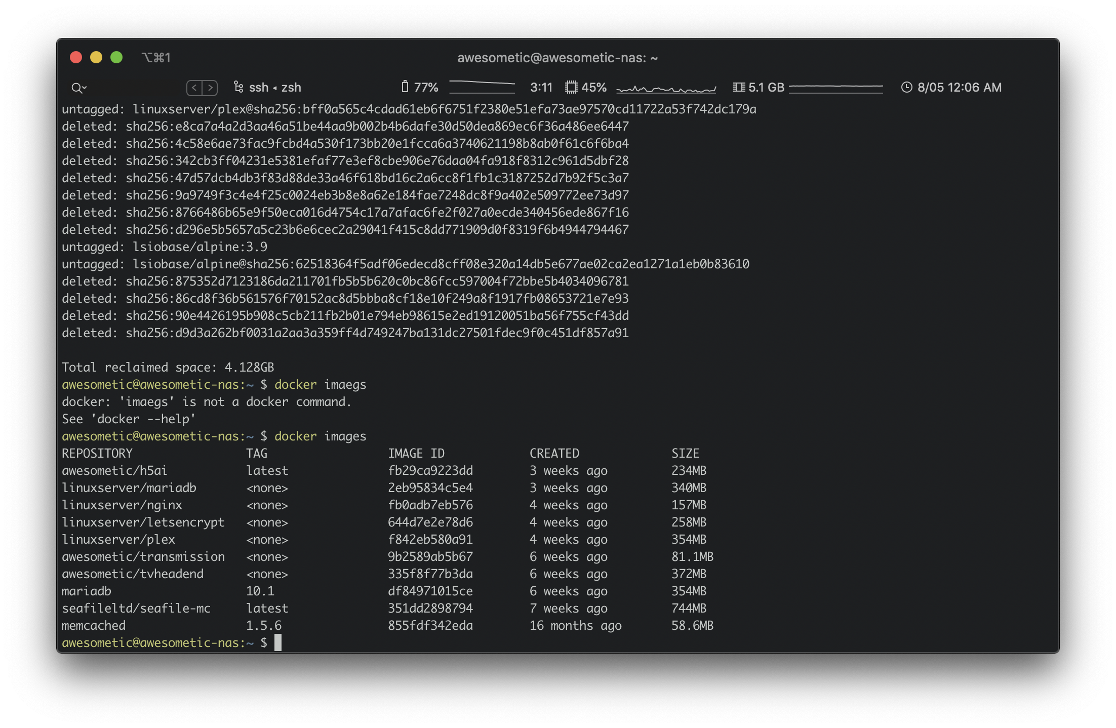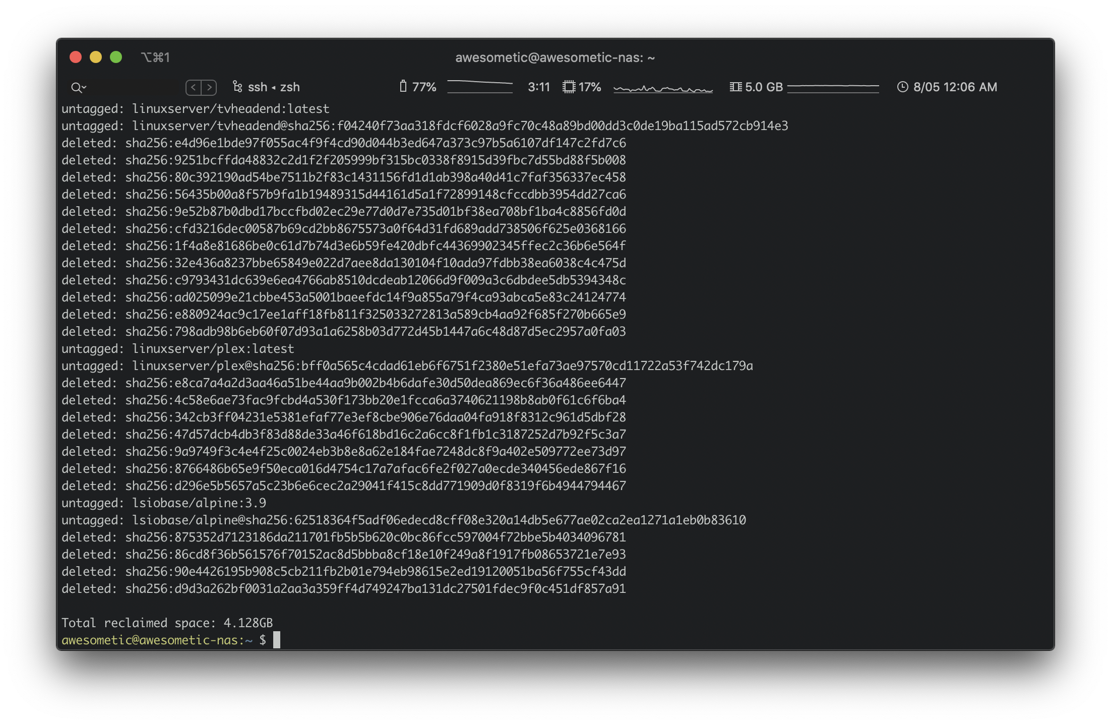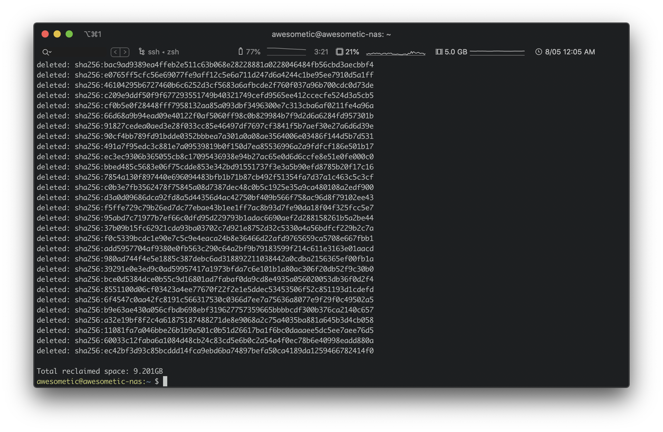 지금 컨테이너에서 사용하고 있는 이미지 말고 모두 지우기 위해 docker image prune -a를 입력했습니다.