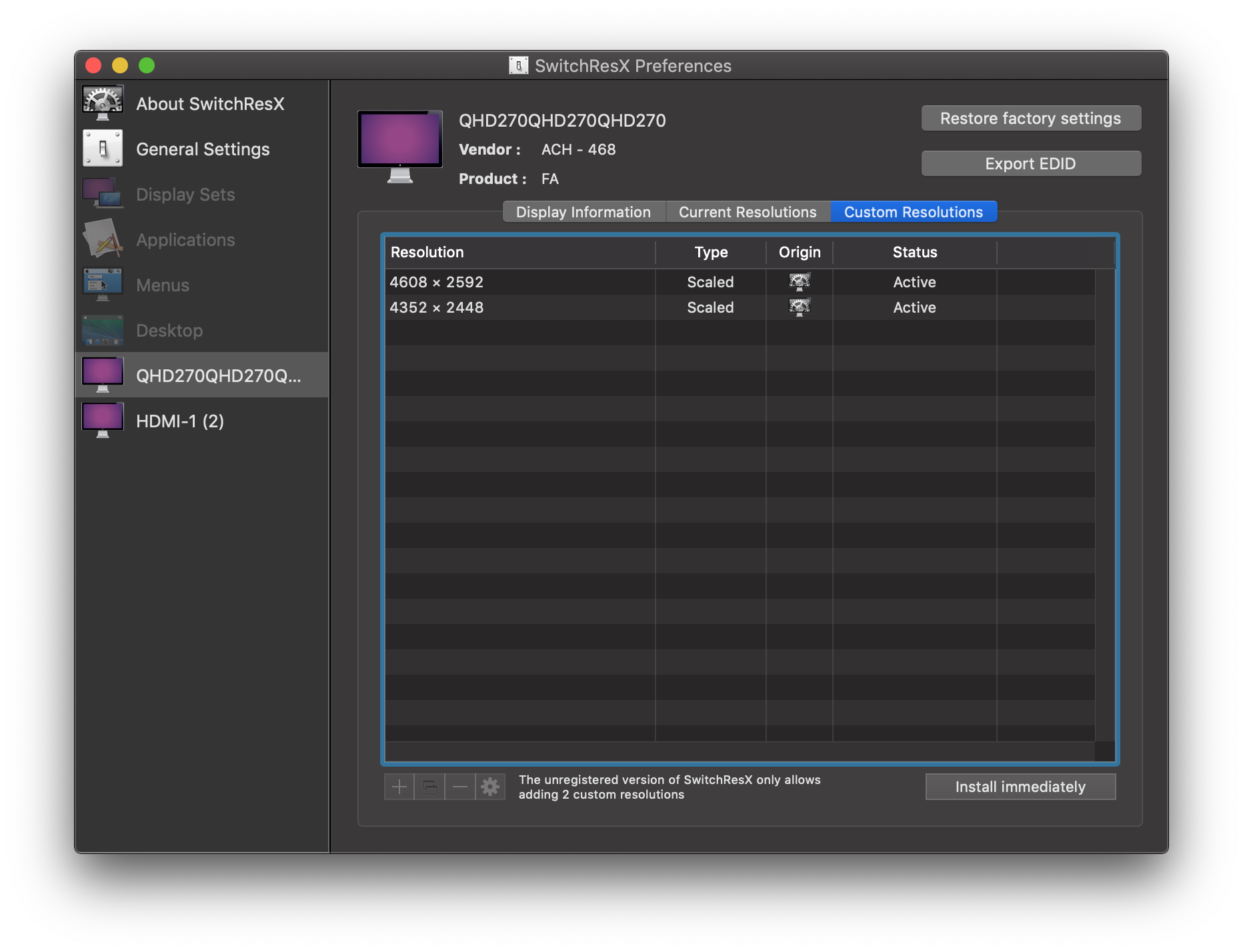 원래는 모니터마다 나올 수 있는 HiDPI 해상도들이 정해져 있나 봅니다. 하지만 27인치 QHD에선 굉장히 제한 적인 해상도만 보여주니, 저희는 새로운 해상도 값(HiDPI가 적용될 수 있는)을 적어 HiDPI를 활성화시켜야 합니다. SwitchResX 프로그램을 다운받아 설치합니다.