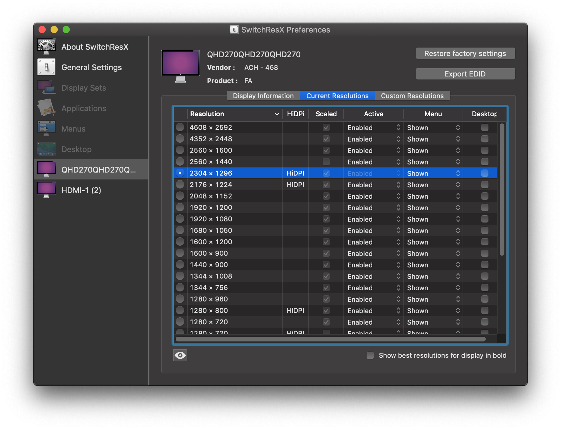 마지막으로 Current Resolutions 탭으로 가 추가한 HiDPI 해상도가 있는 지 확인 후, 클릭해서 적용합니다.