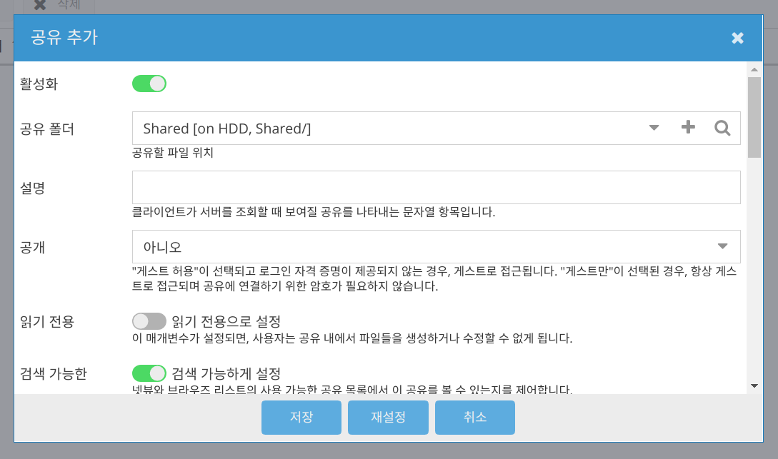 위 스크린샷의 내용처럼, 공유 폴더 항목에 만들어놨던 공유 폴더 하나를 선택합니다. 여러 가지 추가 옵션이 있는데 지금은 모두 무시하셔도 됩니다.