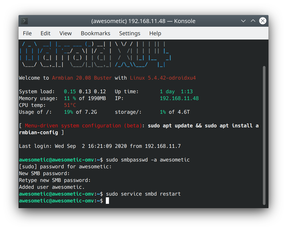 해당 사용자 계정의 로그인 정보로 SSH로 OMV에 접속한 후 아래 명령어를 통해 Samba에 계정을 등록합니다.