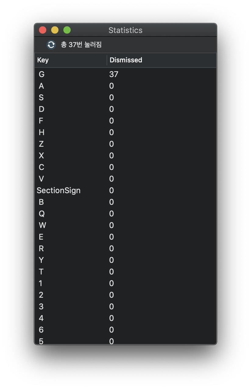 에선 각 키가 몇 번이나 중복 입력됐는지 보여줍니다.