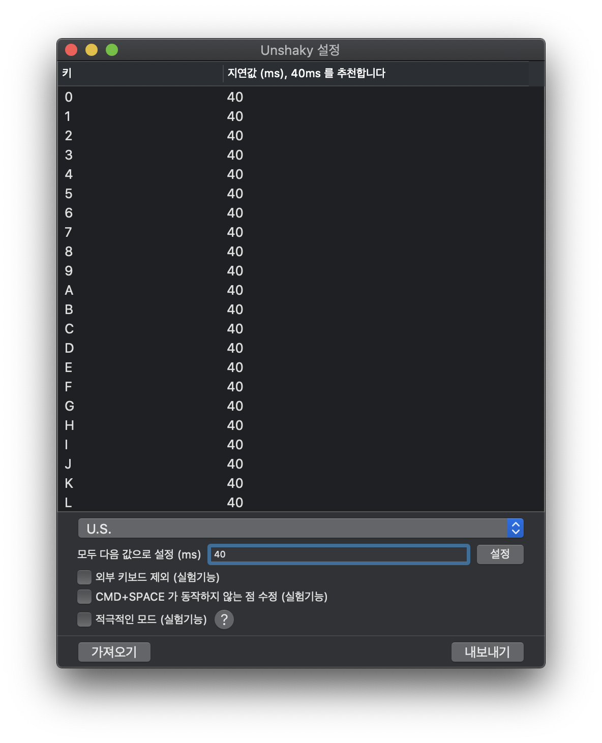 설정은 다음과 같이 모든 키에 대해 지연값 40ms를 적용해줍니다. 40ms 안에 들어오는 중복되는 키는 무시하자는 설정입니다.