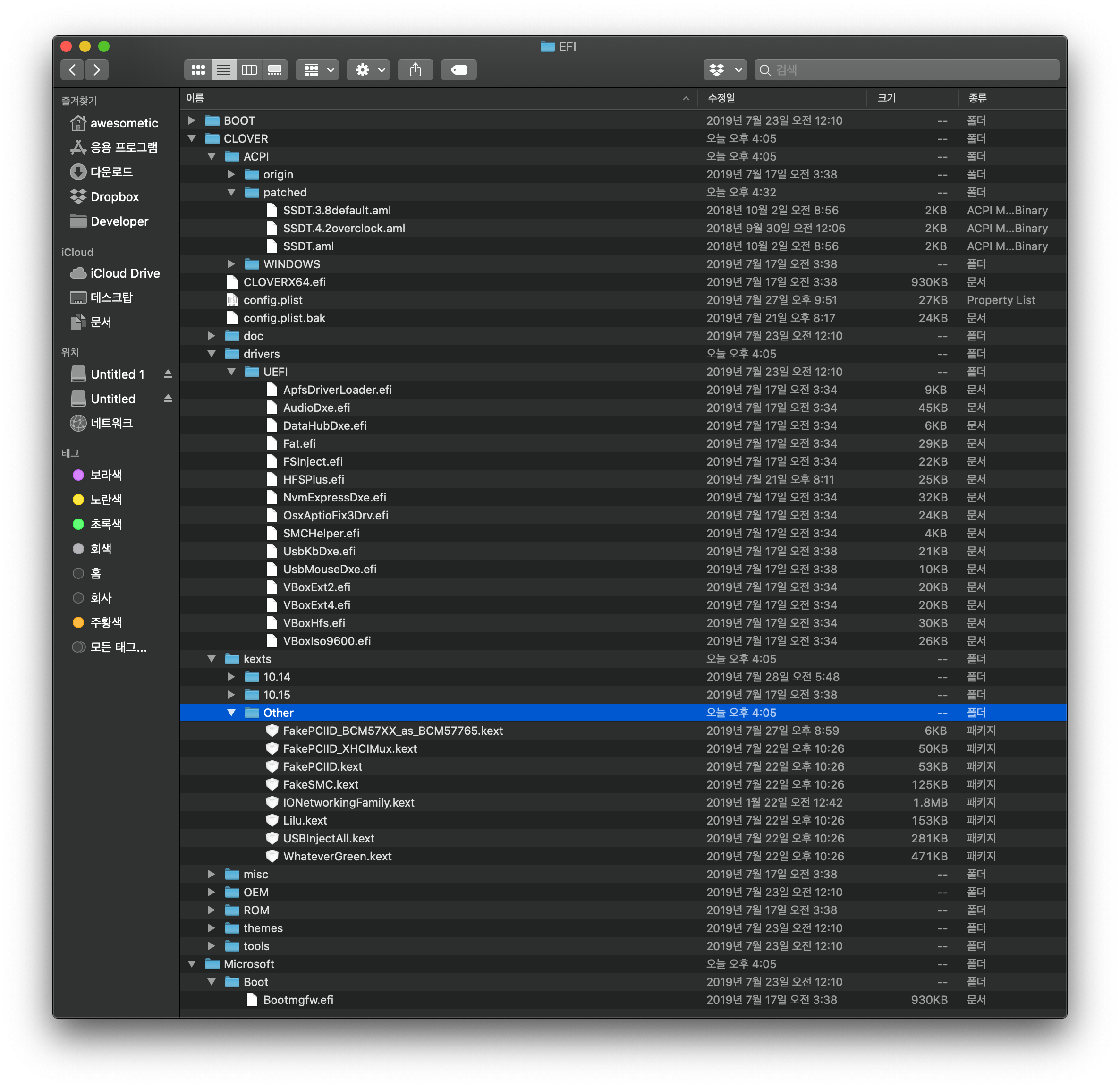 Microsoft/Boot/Bootmgfw.efi파일은 macOS가 설치되는 디스크의 부트 로더입니다. 이름만 저렇게 맞춰주면 애즈락 메인보드에서 알아채주더라구요. 만약 이게 없으면 macOS, 클로버까지 전부 셋팅해도 메인보드에서 부트 옵션에 안 떴었습니다.CLOVER/ACPI/patched안에SSDT.aml파일은 제 i7 2600 CPU를 기준으로 만든 CPU 스피드 스텝 잡아주는 파일입니다. 전원 관리나 클럭 스피드 조정, 또 안정성이 좋아질까봐 해놨습니다. 없어도 큰 문제는 아니었어요. 만약 2600 CPU를 4.2 GHz로 오버클럭 시키셨으면SSDT.4.2overclock.aml을SSDT.aml로 파일 이름을 바꿔주세요.dirvers/UEFI에 로딩되는 드라이버들이 있습니다. 사용하는 데스크탑 환경에 따라 다르지만 전 이렇게 셋팅하고 잘 사용 중이었습니다. 막상 필요 없는 드라이버가 있을 수도 있고, 사용하는 환경에 따라 달라져야 할 것 같아요.kexts/Other엔 딱 필요한 드라이버들이 포함되어 있습니다. 저 중에 하나라도 없음 안 되지만, 역시 주변 환경에 따라 추가할 순 있어요.macOS 10.15 Catalina베타까지는 돌려봤는데 정식 버전은 돌려보지 않았습니다. 아마 잘 될 수도 있고, 안 되면 x86.co.kr 같은 곳에 삽을 들고 찾아가세요.- (중요) UEFI 전용 입니다.