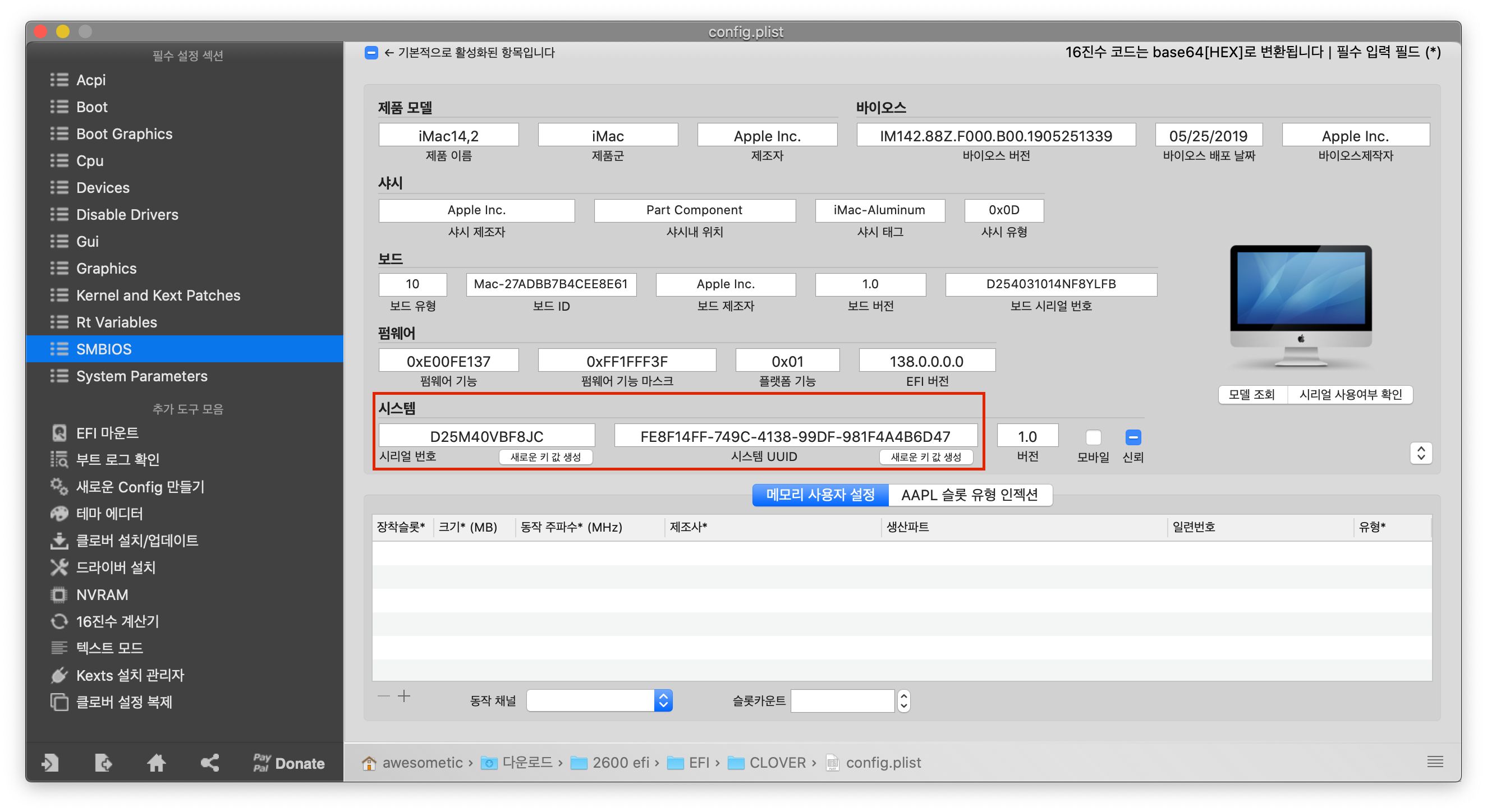 iMessage등 여러 앱에서 충돌을 피하려면Clover Configurator를 이용해 SMBIOS S/N 을 변경해야 합니다. 아래 사진을 참고해서 새로운 키 값 생성을 해주세요.