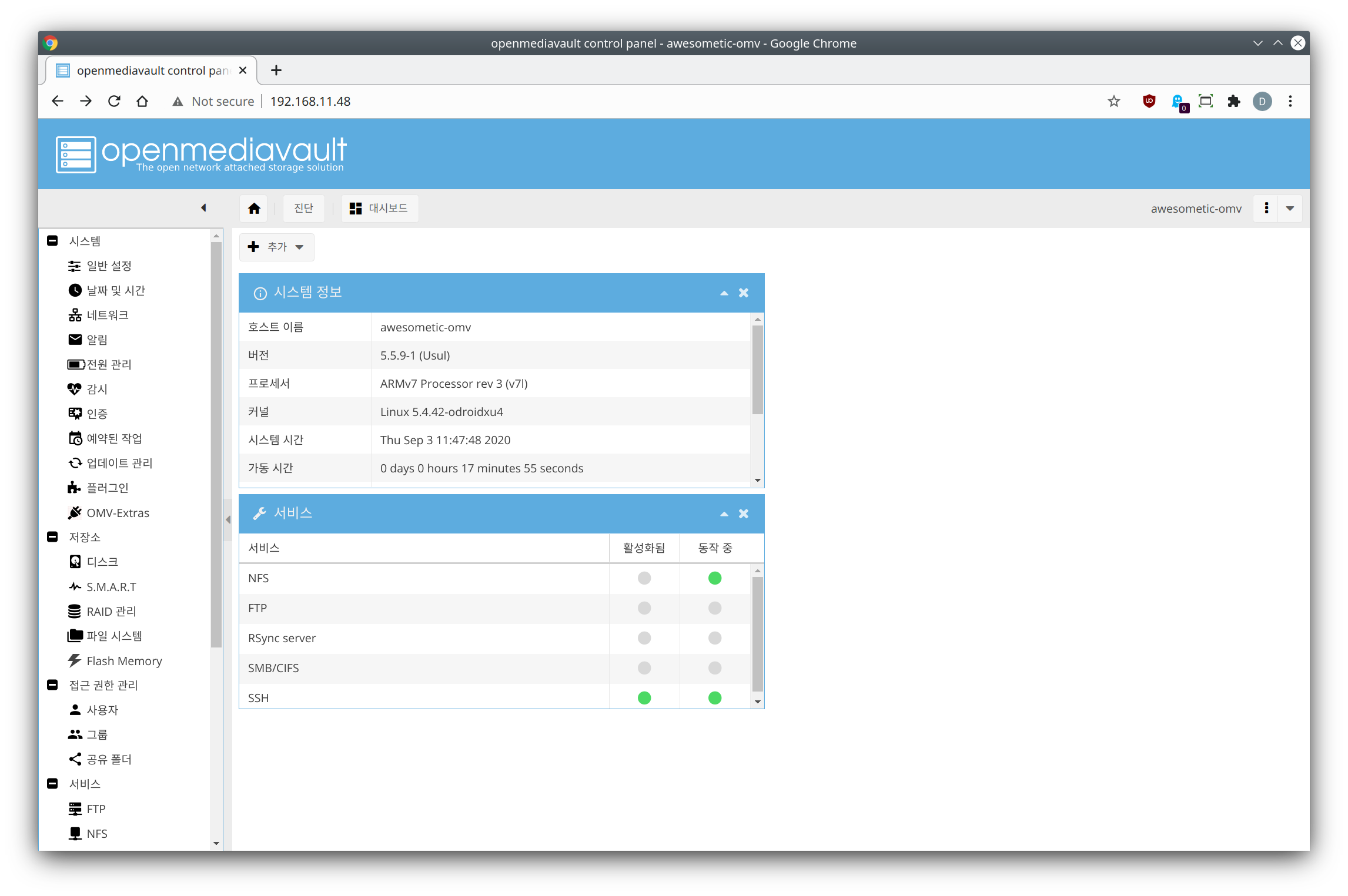 로그인이 완료되면 OMV 5 제어판이 나타납니다.