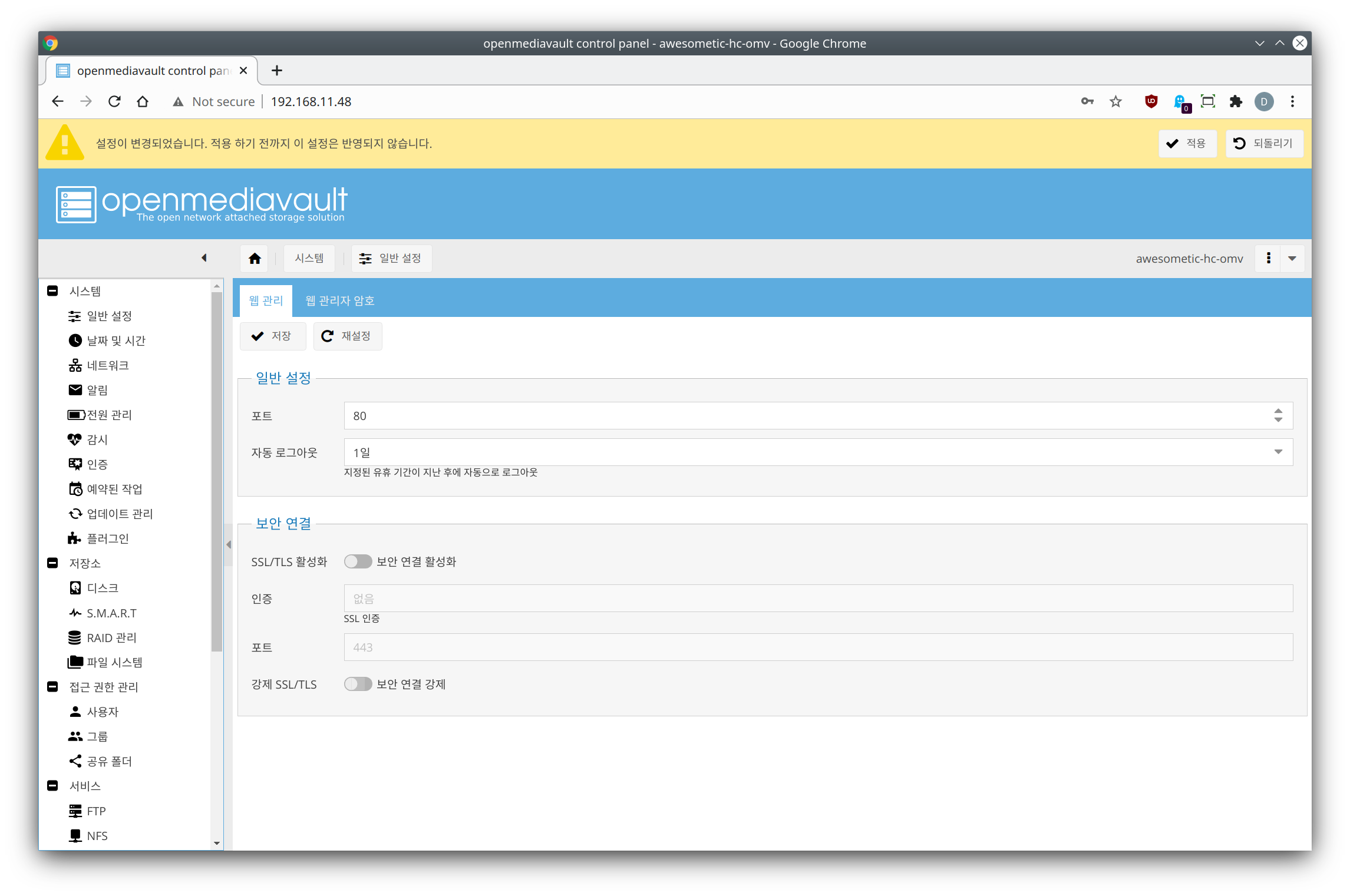 OMV 에선 대부분의 설정 저장은 노란 알림과 함께 적용까지 필요로 합니다. 적용하지 않은 채 다른 메뉴로 가 설정해도 괜찮지만, 가능하다면 한 페이지의 설정 사항은 그 자리에서 적용하고 다른 페이지로 넘어가길 추천합니다.