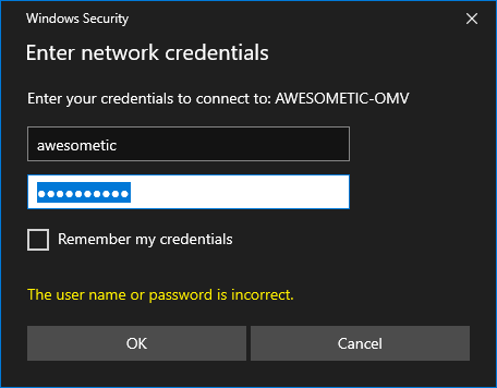 Debian 기반 OS에 OMV 패키지를 설치할 때, 패키지 설치 전에 만들어진 사용자 계정은 Samba 서비스에서 인식하지 못할 수 있습니다. 지금 저희처럼, Armbian OS 의 경우 OS로 처음 SSH에 접속할 때 사용자 계정을 만들었을텐데, 이 사용자 계정으로는 Samba 에 로그인하지 못할 것입니다.