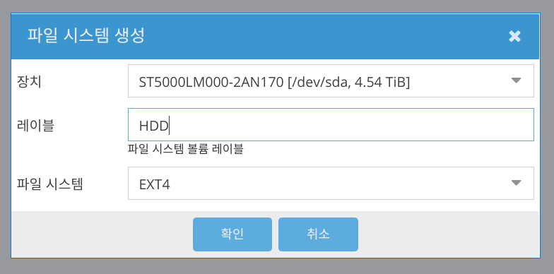 최근 NAS 회사들이 많이 쓰고 있는 BTRFS나 ZFS도 설정할 수 있지만 OMV 웹 패널에서는 해당 파일 시스템들에 대한 특별한 기능들을 설정할 수 없습니다. 가장 간단하고 안정성이 입증된 EXT4를 사용하는 것을 추천합니다.