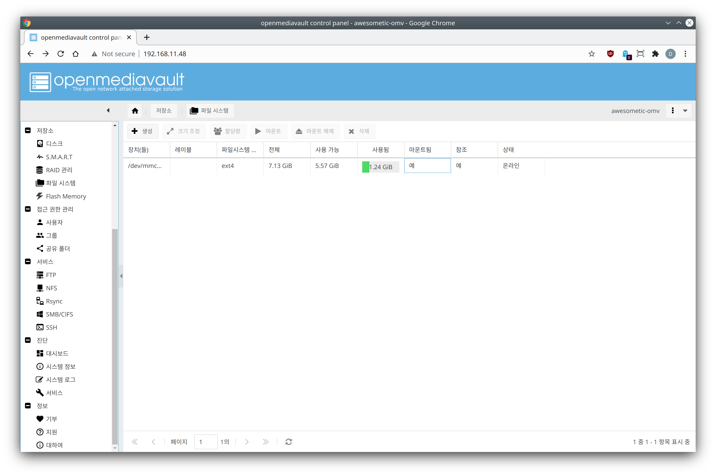 여기까지 진행하셨으면, 이제 준비된 디스크로 OMV 서비스에서 사용할 수 있도록 공유 폴더를 만들어줘야 합니다.