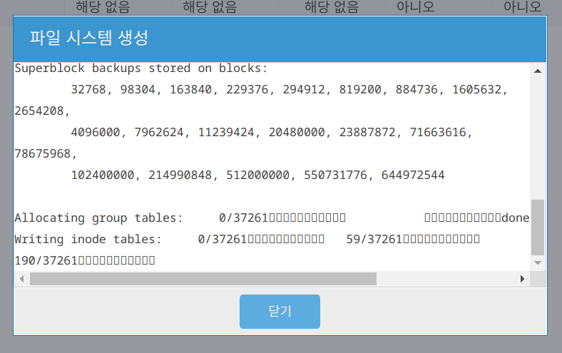 확인을 누르면 하드디스크 내 모든 파일이 지워진다는 경고 메세지가 나오는데, 파일 시스템을 새로 생성하기 위해선 모든 파일을 지워야만 하니 다시 확인 버튼을 눌러 진행합니다. 이 작업은 하드디스크 크기에 따라 오래 걸릴 수 있습니다.