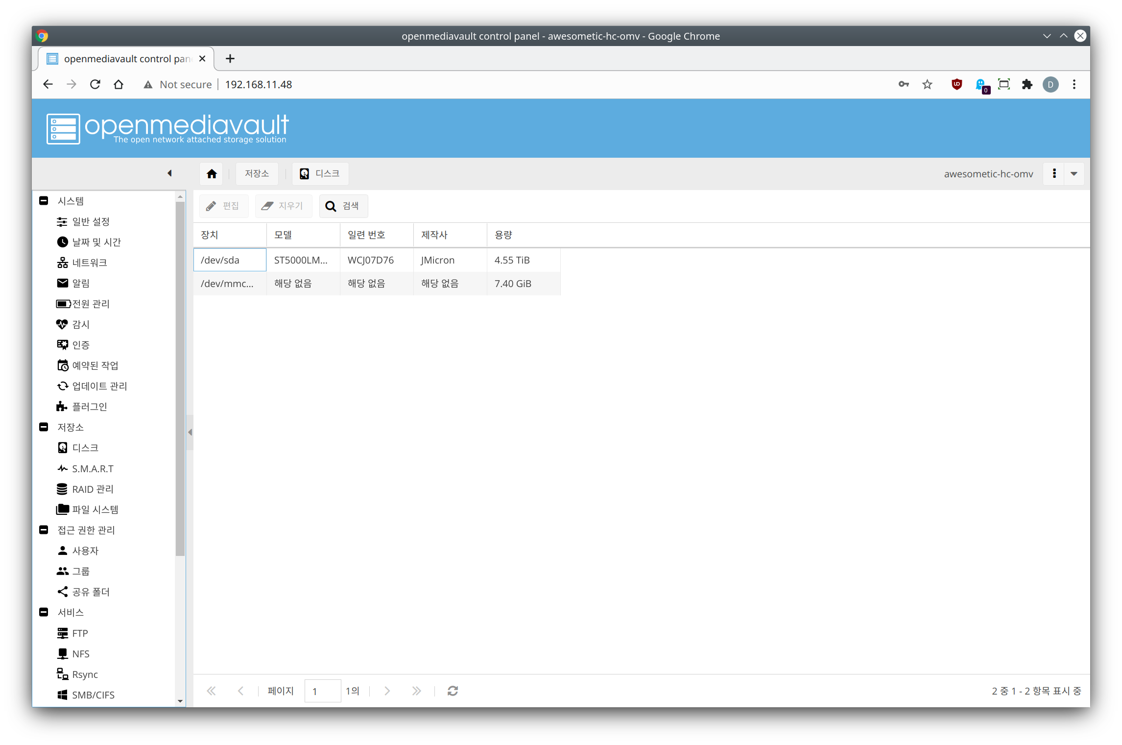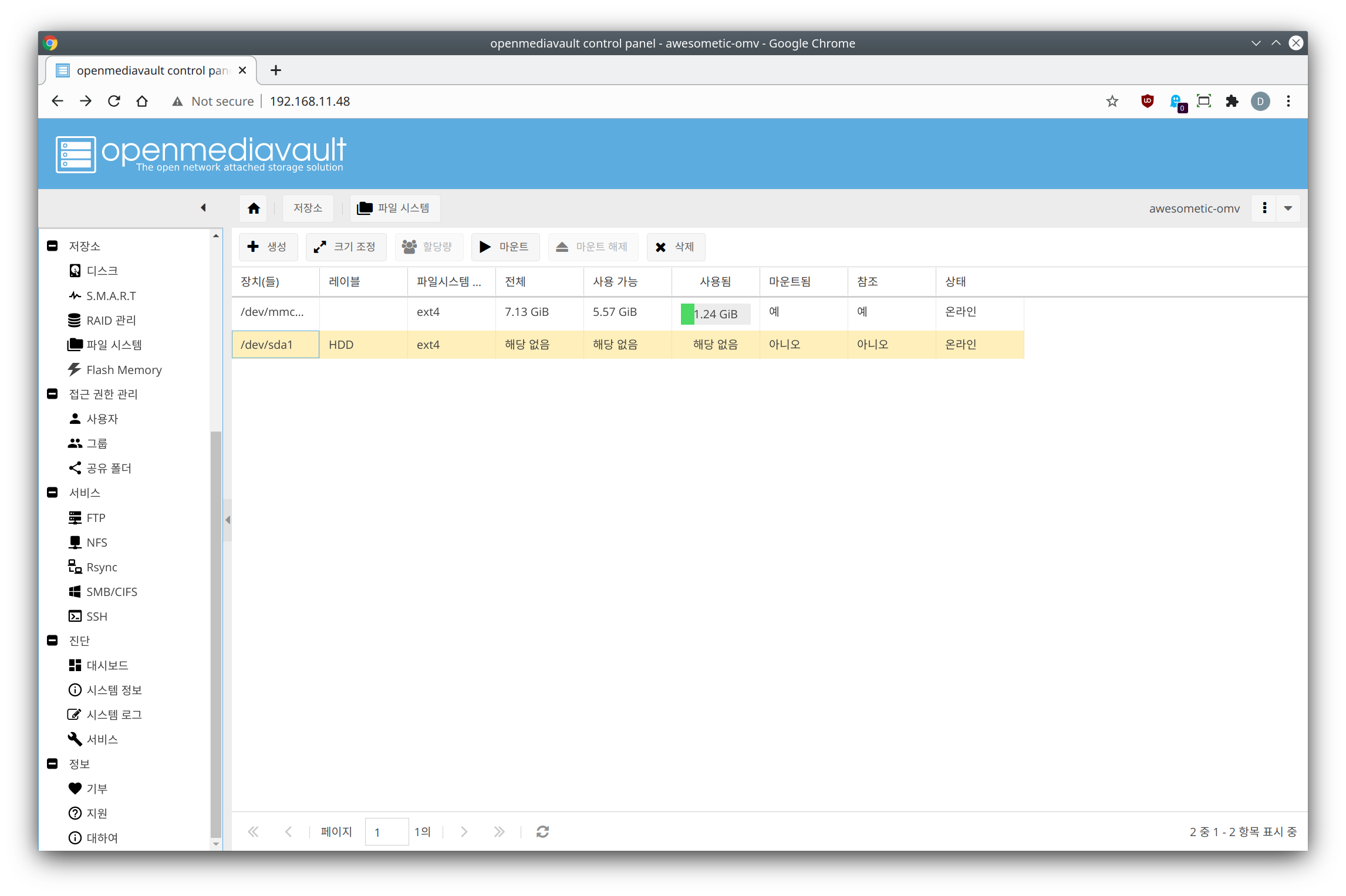 OMV 에선 시스템에 장착된 HDD들을 웹으로 관리할 수 있습니다. SSH로 접속해서 하는 것보다 웹으로 하는 것이 OMV 시스템을 더 안정적으로 동작하게끔 유지시켜줍니다.