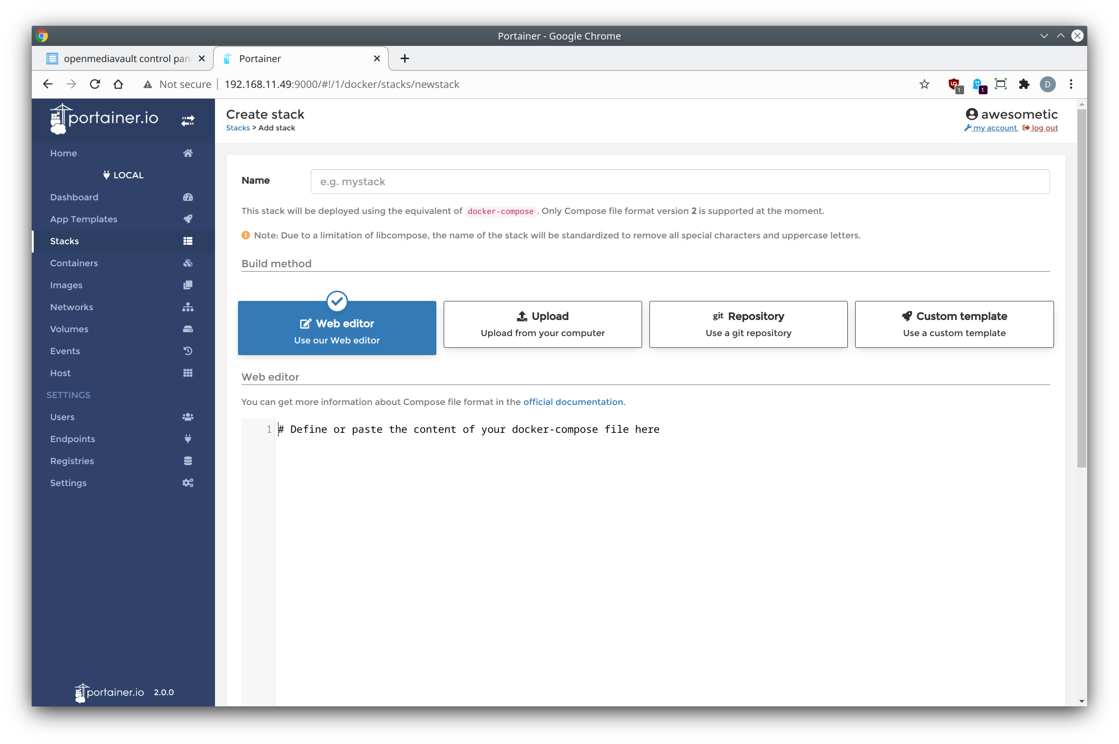Portainer에서 Stack은 docker-compose 를 관리 Portainer의 규칙에 맞게 관리하기 위한 일종의 Superset입니다. 실제로 작동하진 않지만, 아래와 같은 docker-compose 설정값을 그대로 넣을 수 있습니다.