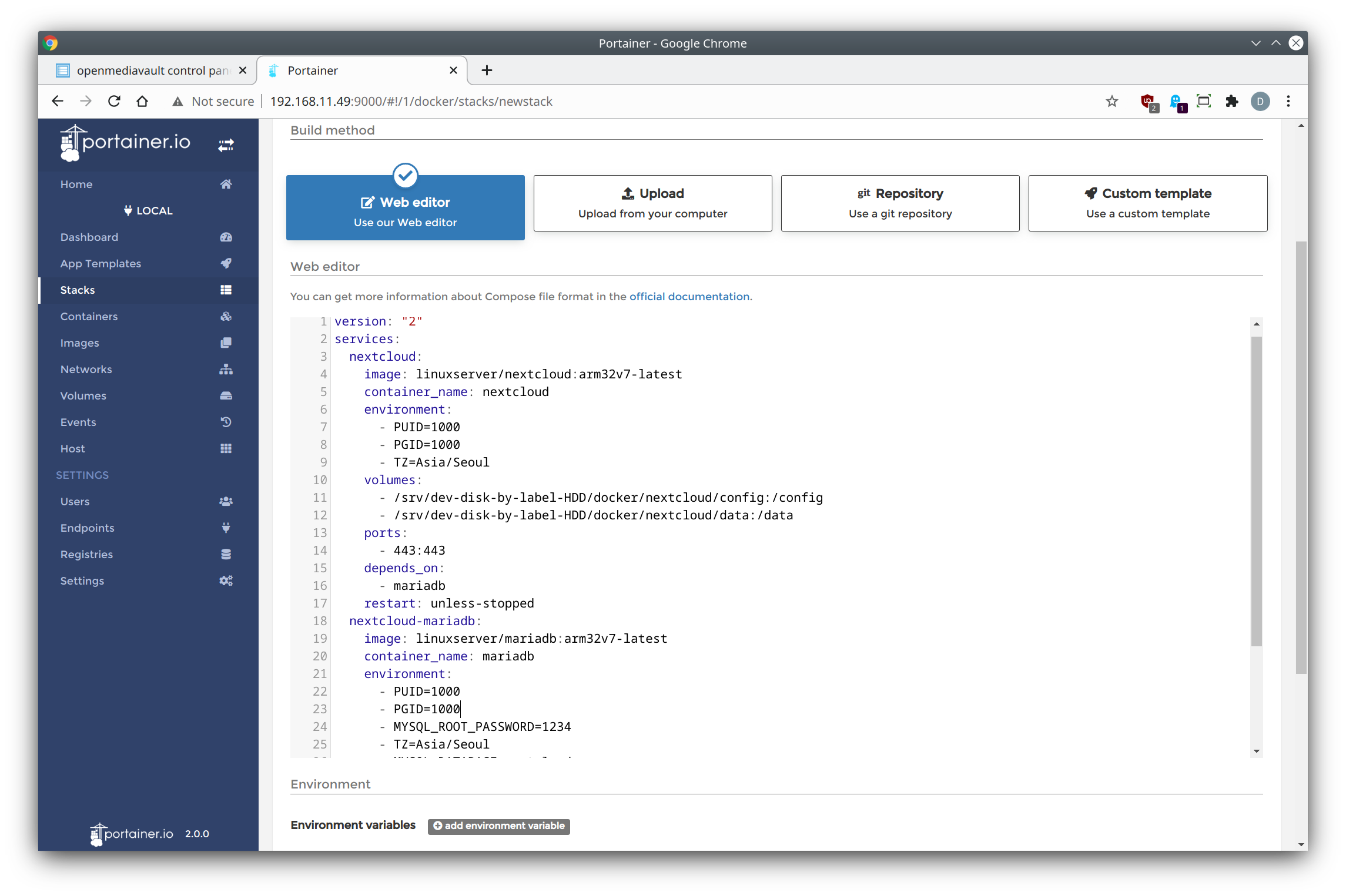 - environments: PUID, PGID는 그대로 두셔도 됩니다. nextcloud-mariadb 컨테이너의 MYSQL_ROOT_PASSWORD와 MYSQL_USER, MYSQL_PASSWORD는 자신의 것으로 바꿔줍니다.
