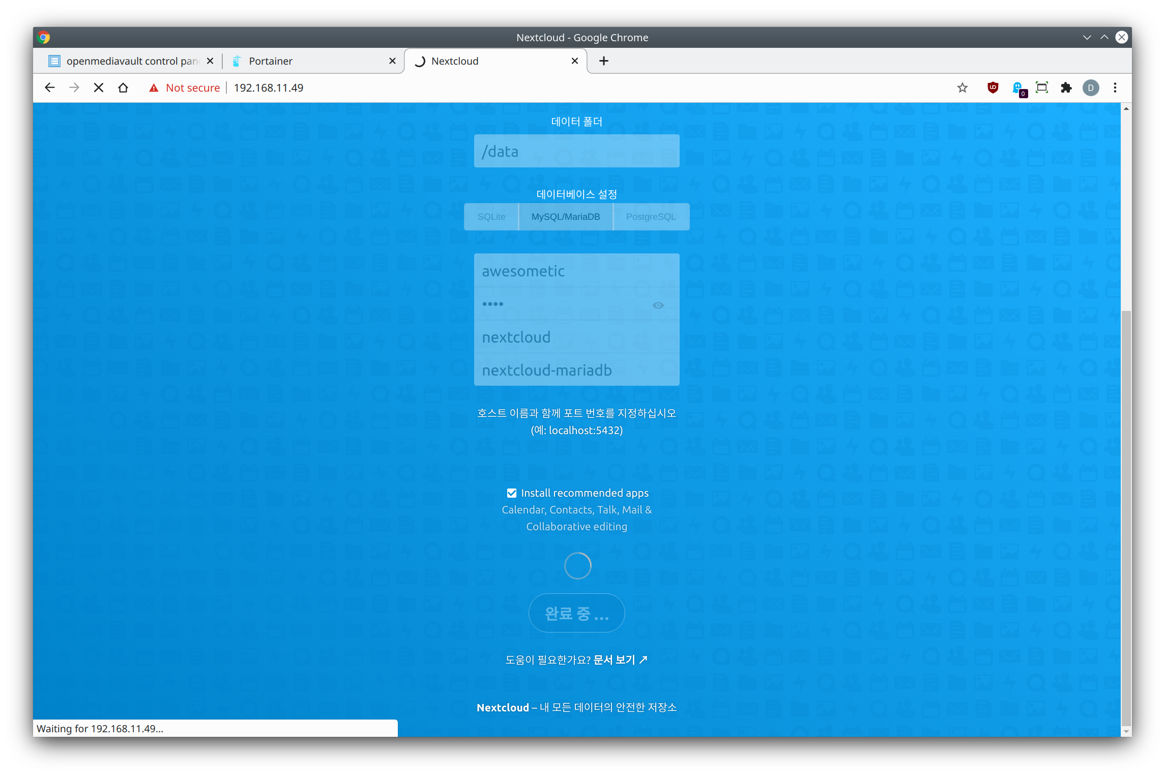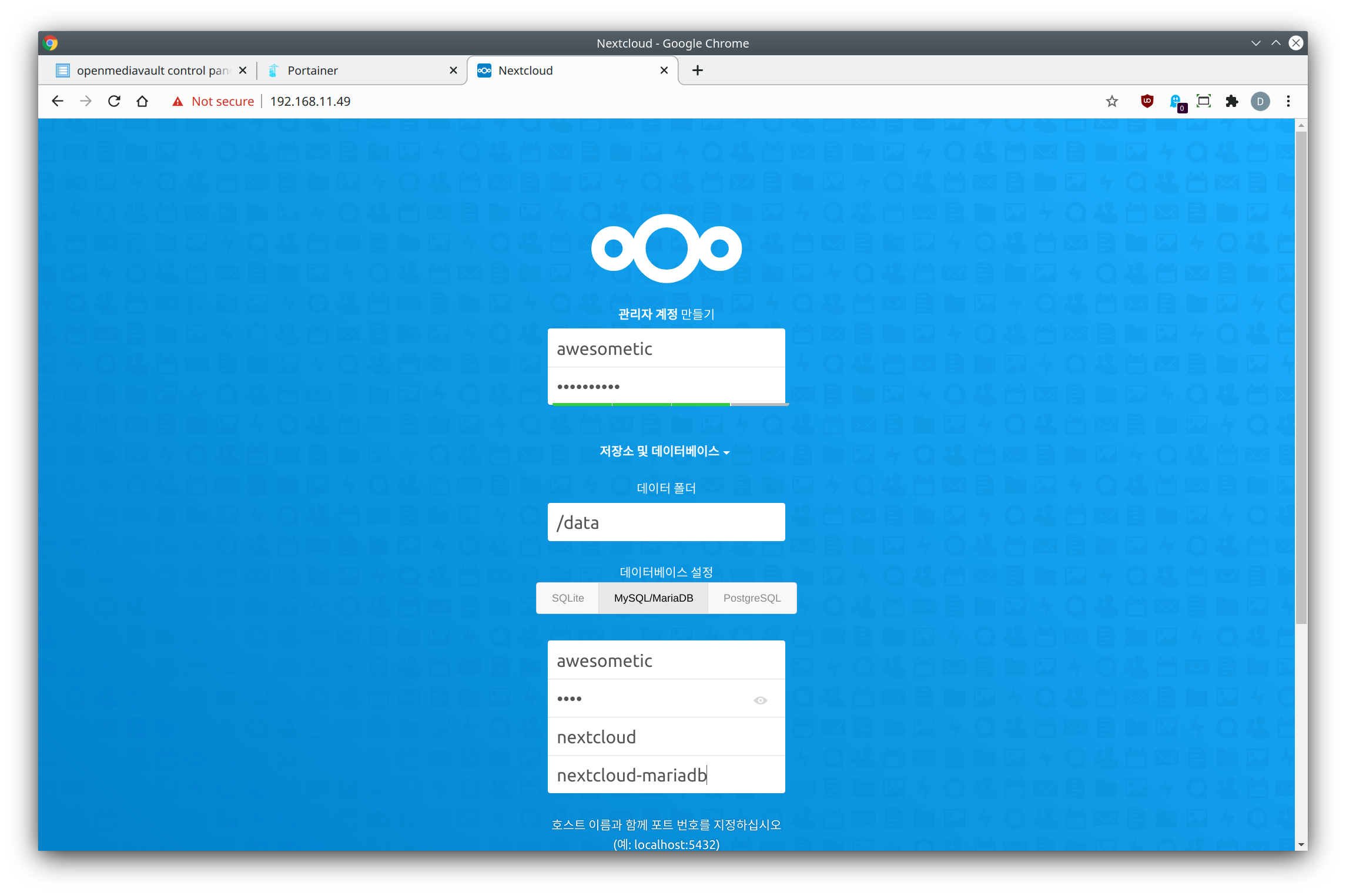 Nextcloud 관리자 계정과 데이터베이스 연결 설정