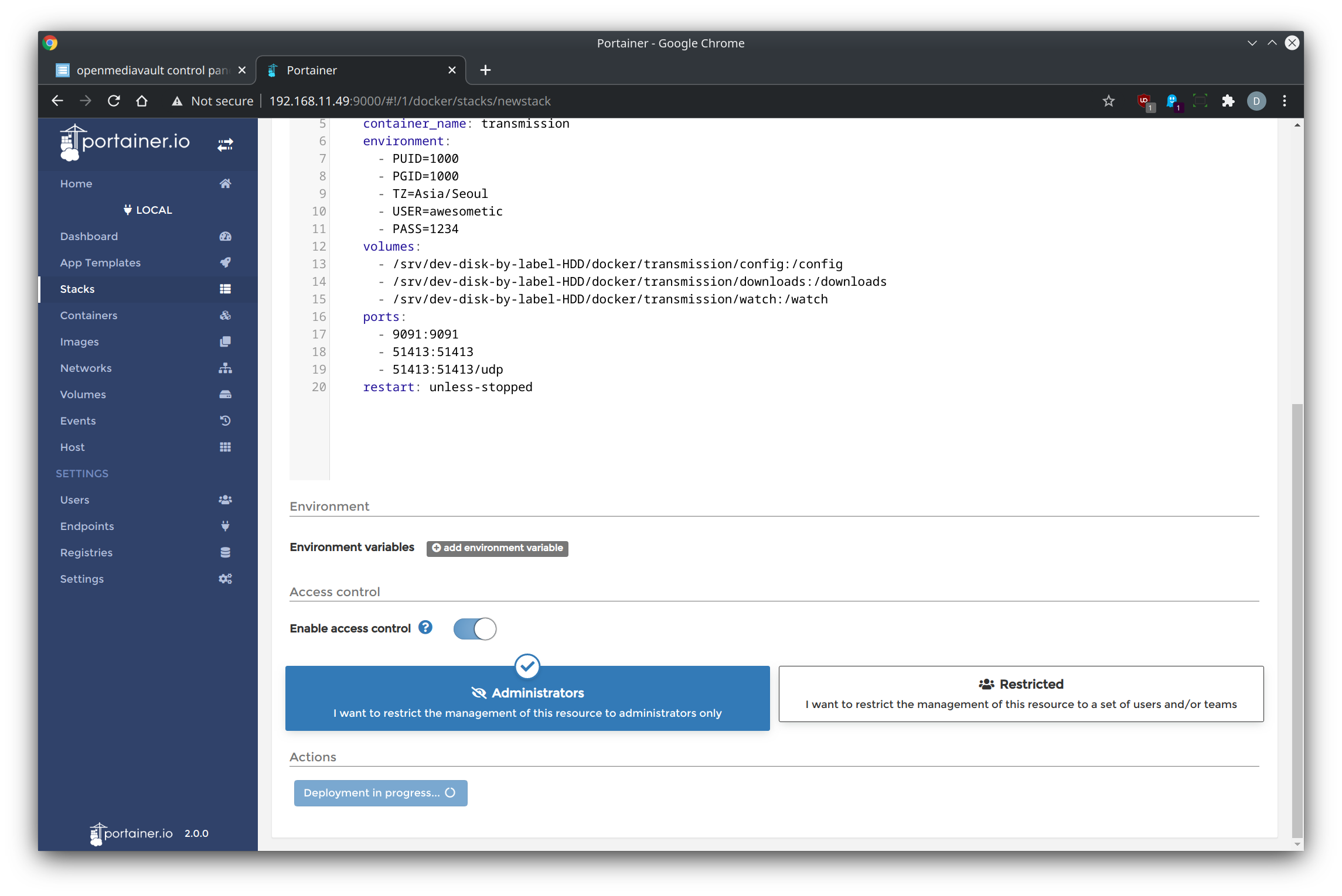 - environments: PUID, PGID는 그대로 두셔도 됩니다. USER와 PASS는 Transmission 웹 페이지에 들어갈 때 사용할 계정 정보입니다. 자신의 것으로 바꿔 사용합니다.