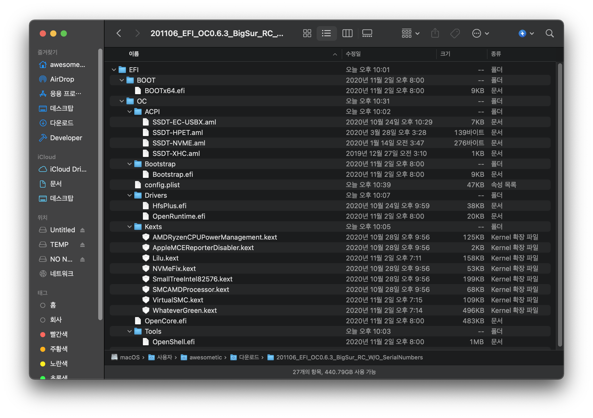 이번에 RC 버전 올리면서 OpenCore 0.6.3으로 업데이트한 EFI 올립니다. 현재 일자 기준 (2020년 11월 6일) 으로 사용된 모든 SSDT와 Kext는 최신 버전입니다.