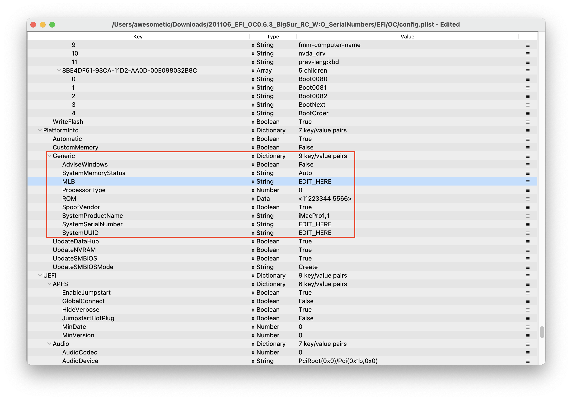 EFI에서 시리얼 넘버쪽은 "EDIT_HERE"로 바꿔놨습니다.
