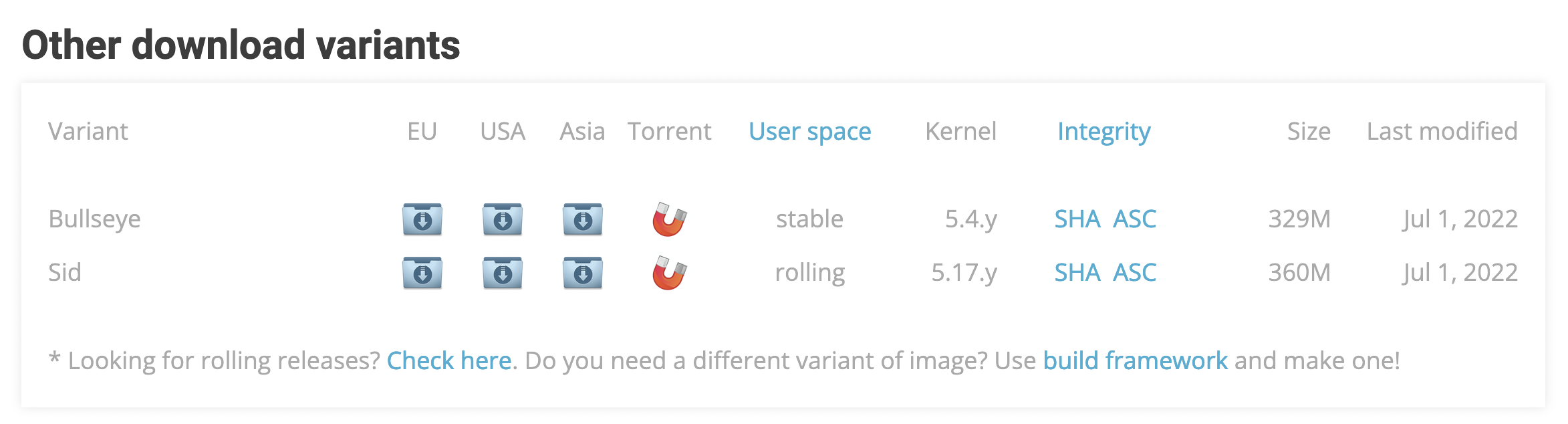 Armbian 홈페이지의 Odroid XU4 항목으로 가서 페이지 맨 하단의 Bullseye 이미지를 다운로드 합니다.