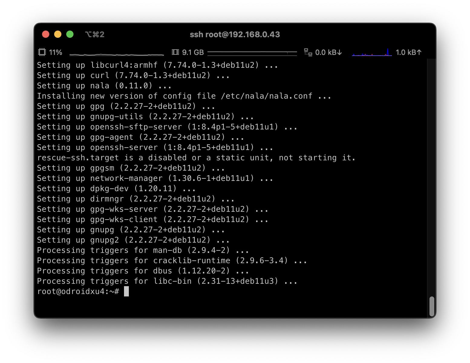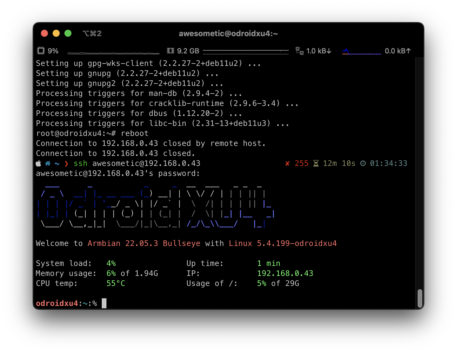 충분한 시간이 있었으니 Odroid XU4가 준비되었을 것입니다. 인터넷 선이 연결되어 있어, 같은 공유기 내의 다른 기기에서 SSH를 통해 접속하여 초기 설정이 가능합니다.