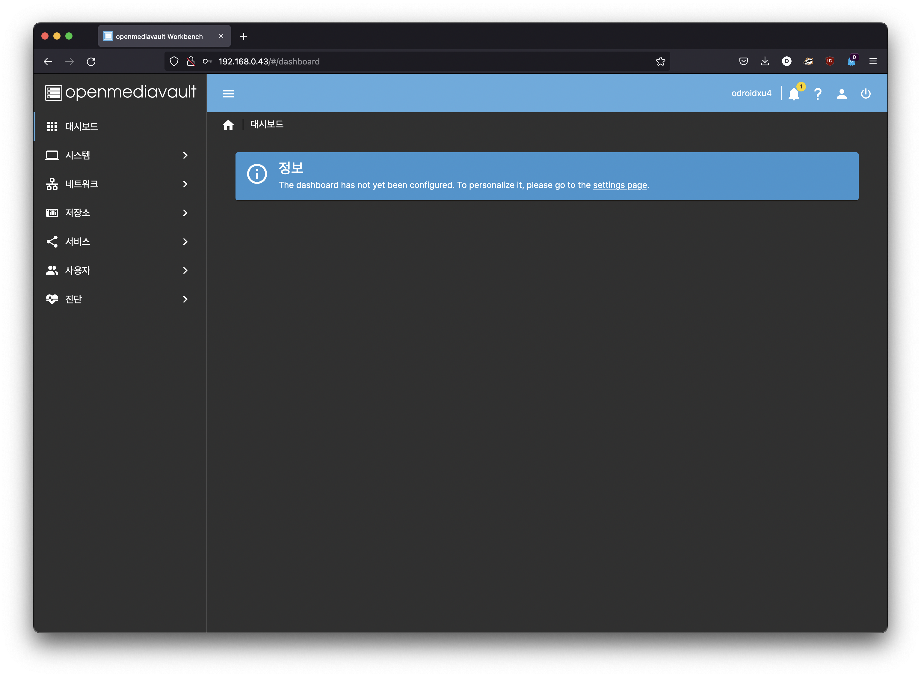 초기 관리자 계정 정보는 "admin" 에 "openmediavault" 입니다. 로그인하면 아래와 같은 화면이 나타납니다.