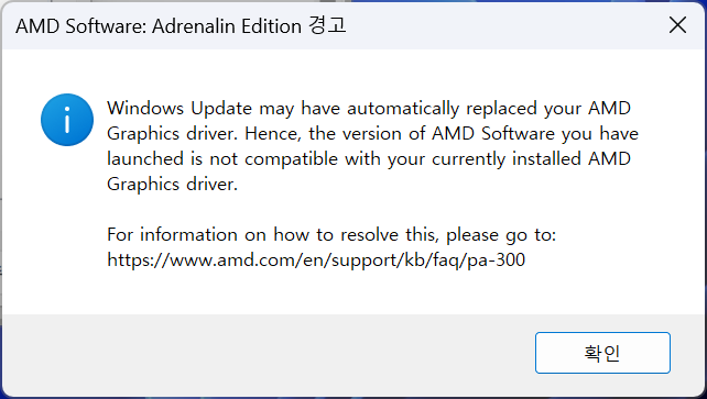 잘 사용하고 있었는데 어느 순간 윈도우 업데이트에서 다시 라데온 드라이버를 찾아서 혼자 설치하더라구요. 분명 더 이전 버전인데, 왠지는 모르겠지만 자동으로 감지해서 최신 드라이버를 구형으로 다시 덮어버립니다. 그래서 버전이 안 맞으니 다시 아드레날린 툴도 실행이 안 되기 시작했습니다.