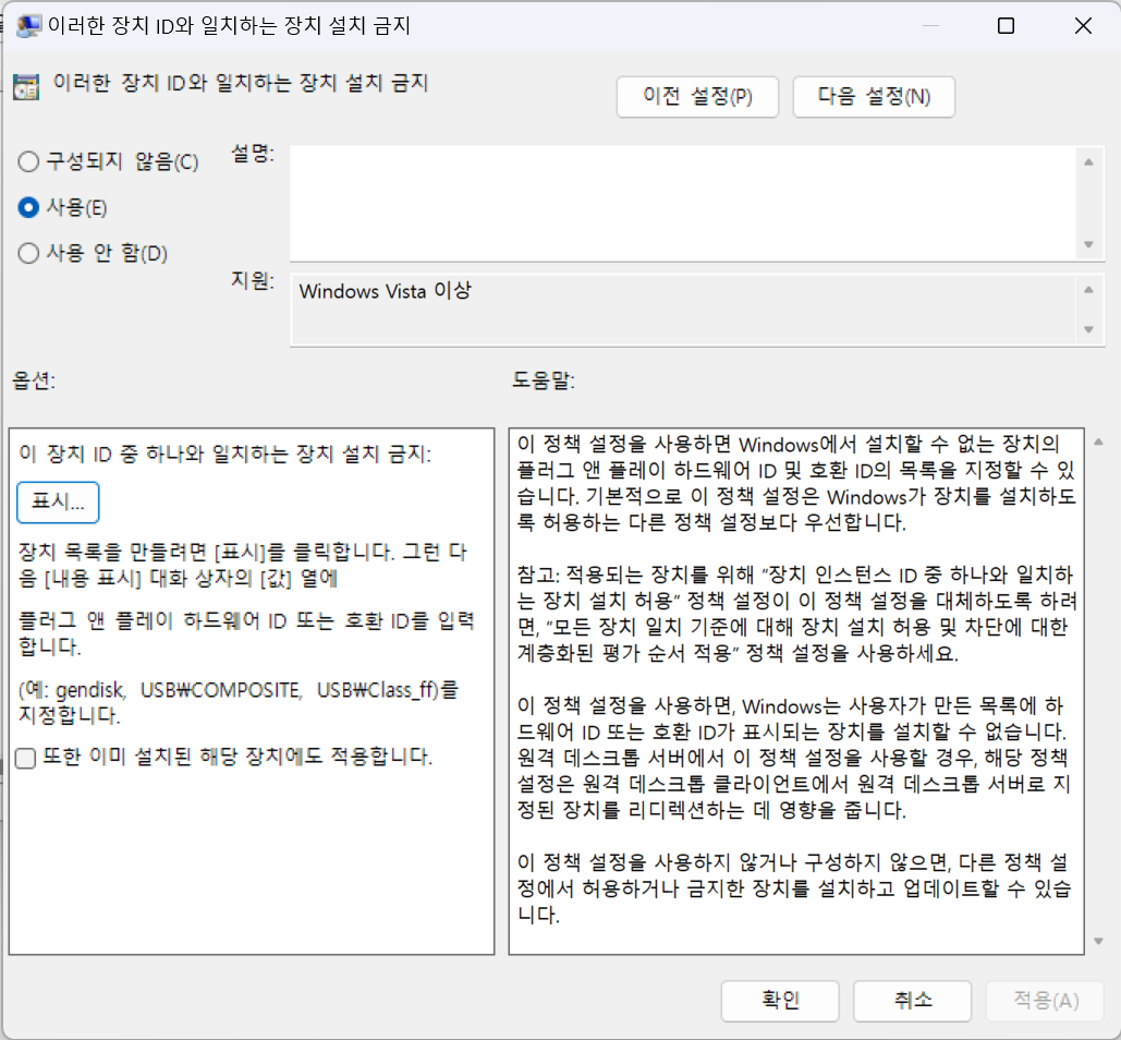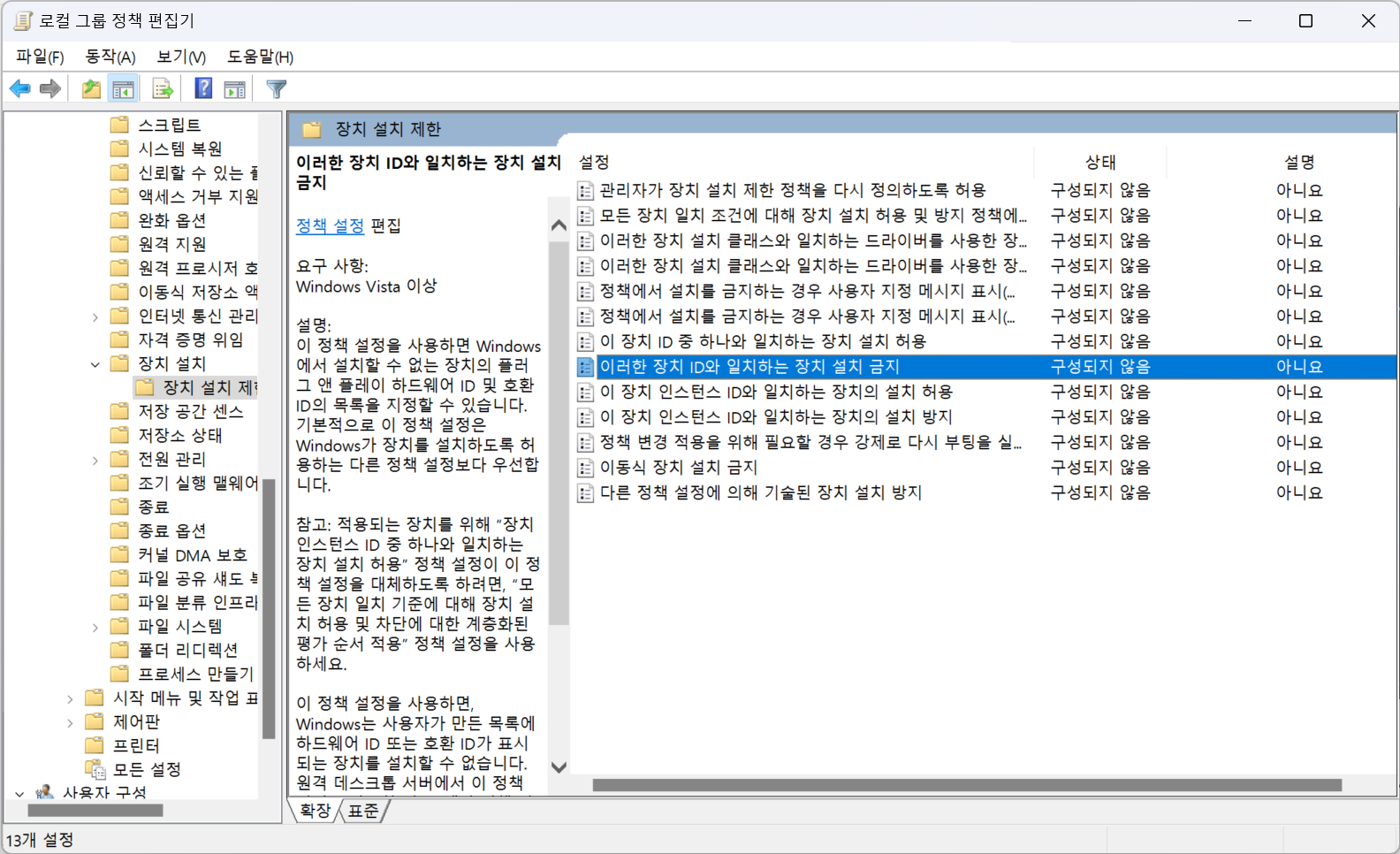 컴퓨터 구성 - 관리 템플릿 - 시스템 - 장치 설치 - 장치 설치 제한으로 이동하고 "이러한 장치 ID와 일치하는 장치 설치 금지" 항목을 더블클릭합니다.