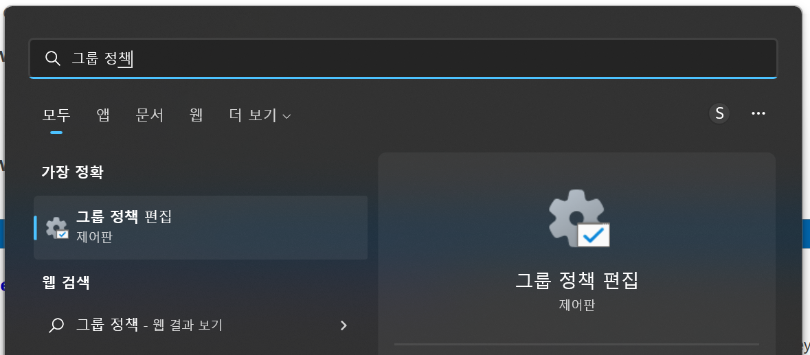 시작 메뉴에 그룹 정책 편집을 검색해 실행합니다.