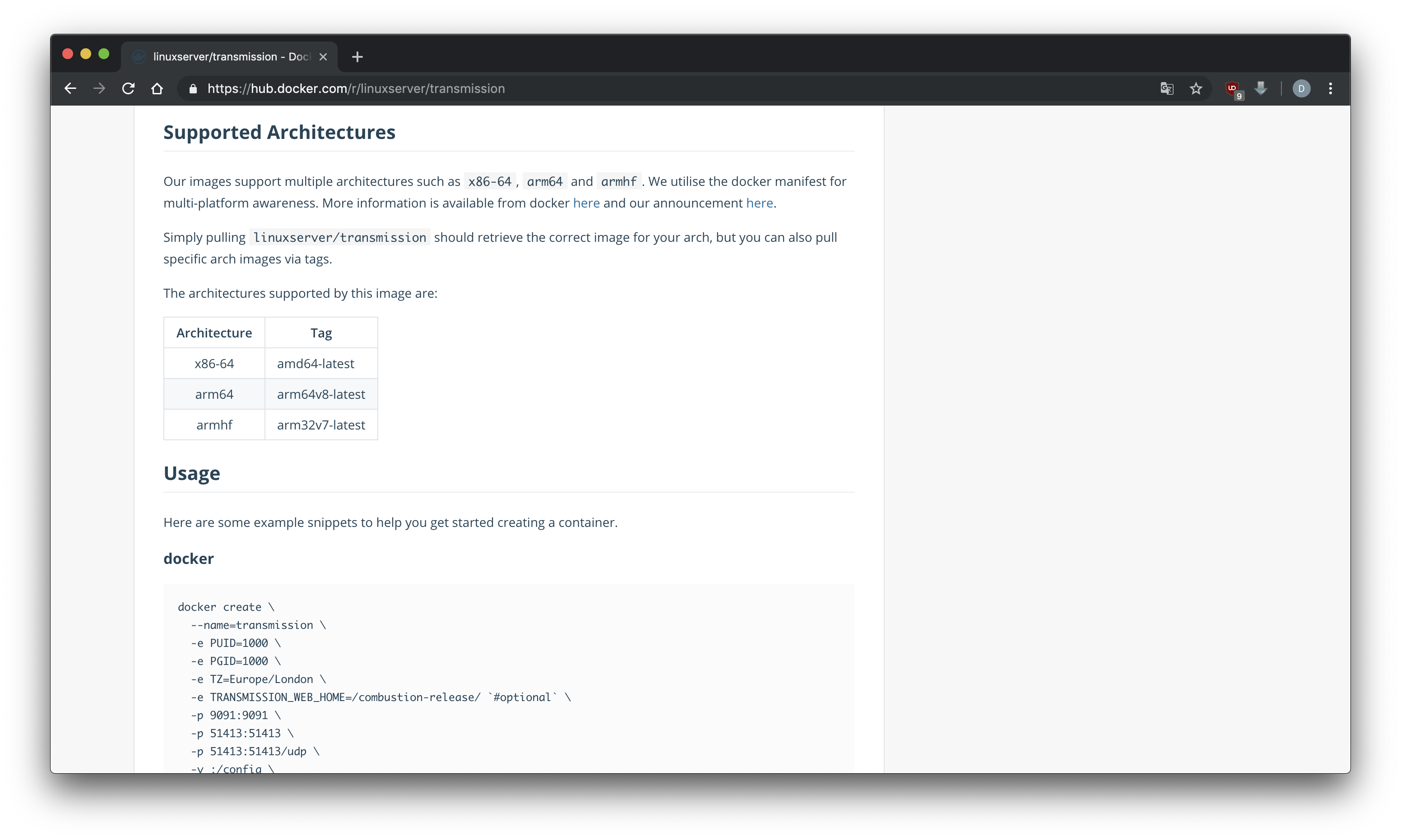 LinuxServer.io는 서비스 별로 각자 사용법이 조금 다르고, 기능도 조금 다르기 때문에 추가 사용법도 제공해줍니다. 예를 들어 이 트랜스미션 이미지에는 Securing the webui with a username/password.항목이 있네요. 웹 UI에 암호를 거는 기능은 트랜스미션의 기본 기능인데, LinuxServer.io에서는 각 서비스의 기능들을 존중하기 때문에 친절하게 알려줍니다.